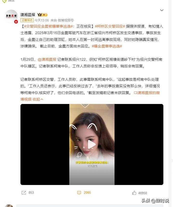 金晨意外被翻出去年底的一桩旧案——驾驶车辆发生碰撞后离场、由助理代为认责、后续还牵涉保险欺诈嫌疑。